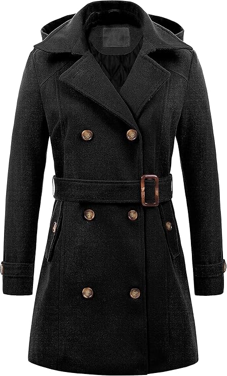 Womens Wool Blend Pea Coat Fashion Winter Dressy Overcoat Single Breasted Trench Jackets with Hood