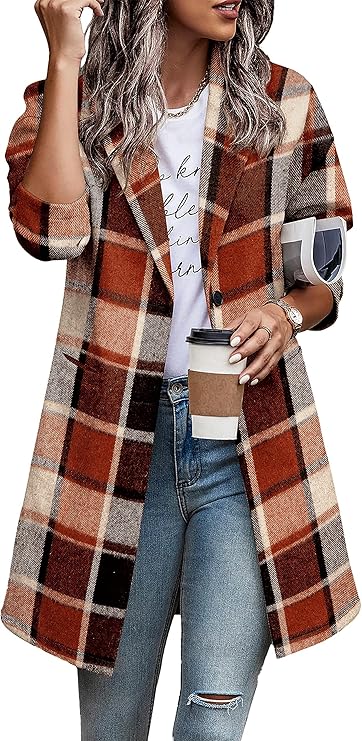 Women's Long Plaid Shirt Jacket Shacket Lapel Button Down Woolen Blend Casual Tartan Over Shirt Trench Coat