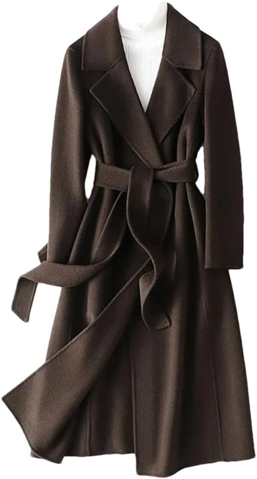 Women's Winter Double Breasted Wool Coat Long Sleeve Notch Lapel Midi Long Winter Trench Coat with Belt