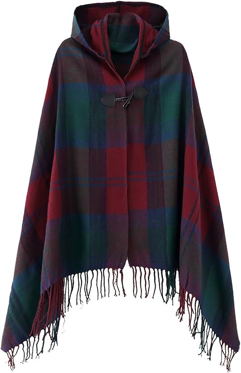 Women's Vintage Plaid Knitted Tassel Poncho Shawl Cape Button Cardigan