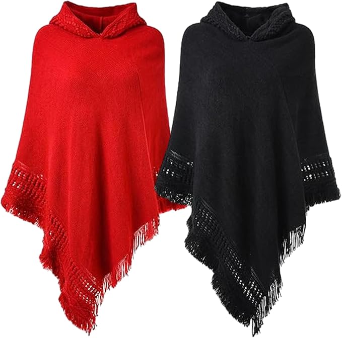 2 Pcs Poncho Sweaters for Women Knitted Hooded Cape with Fringed Hem Crochet Poncho Pullover Sweaters Knit Pattern