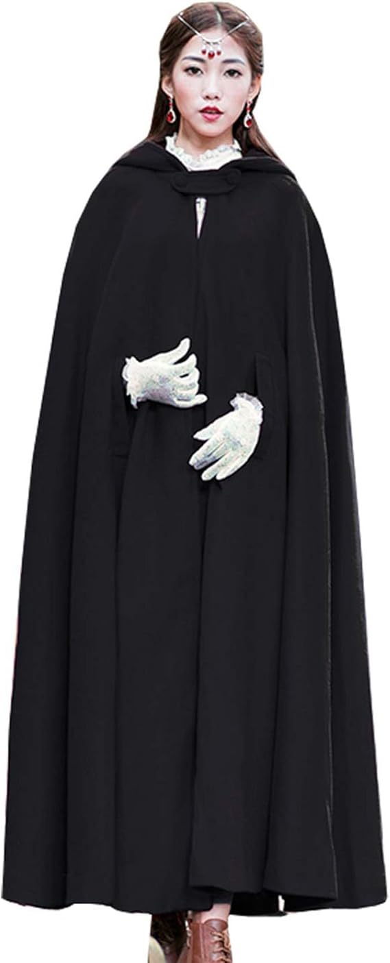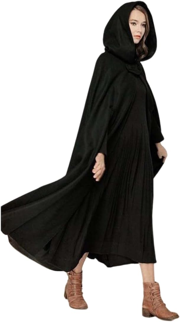 Women Wool Blend Hooded Cape Fall Winter Cloak with Hood Windproof Poncho Maxi Coat