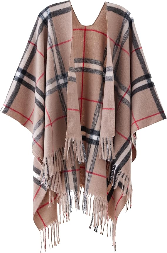 Women Plaid Shawl Wrap Open Front Poncho Plus Size Sweater Coat for Fall Winter