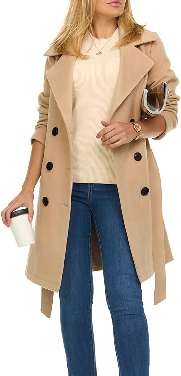 Womens Pea Trench Coats Notched Lapel Double Breasted Belted Business Casual Jackets Outerwear